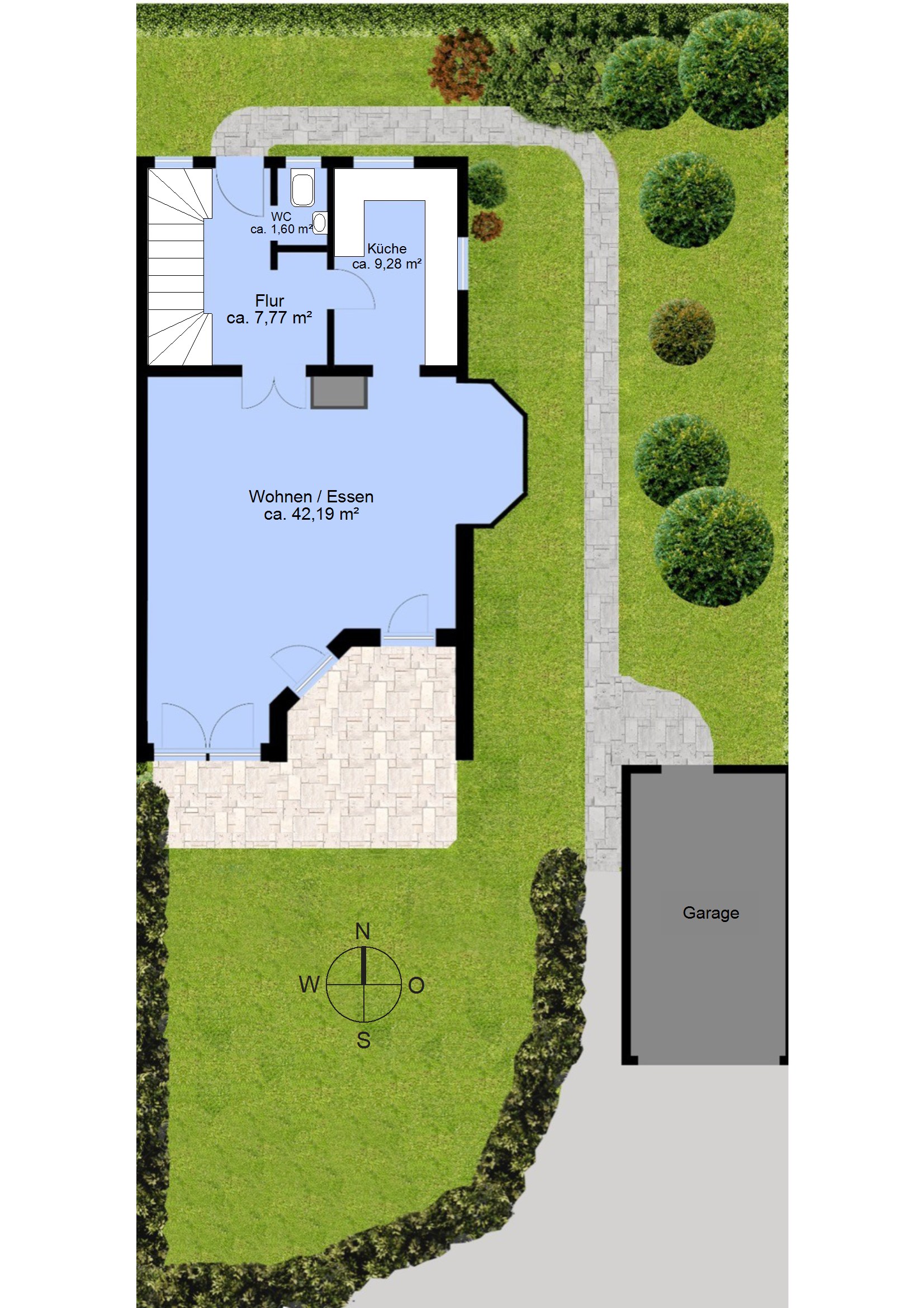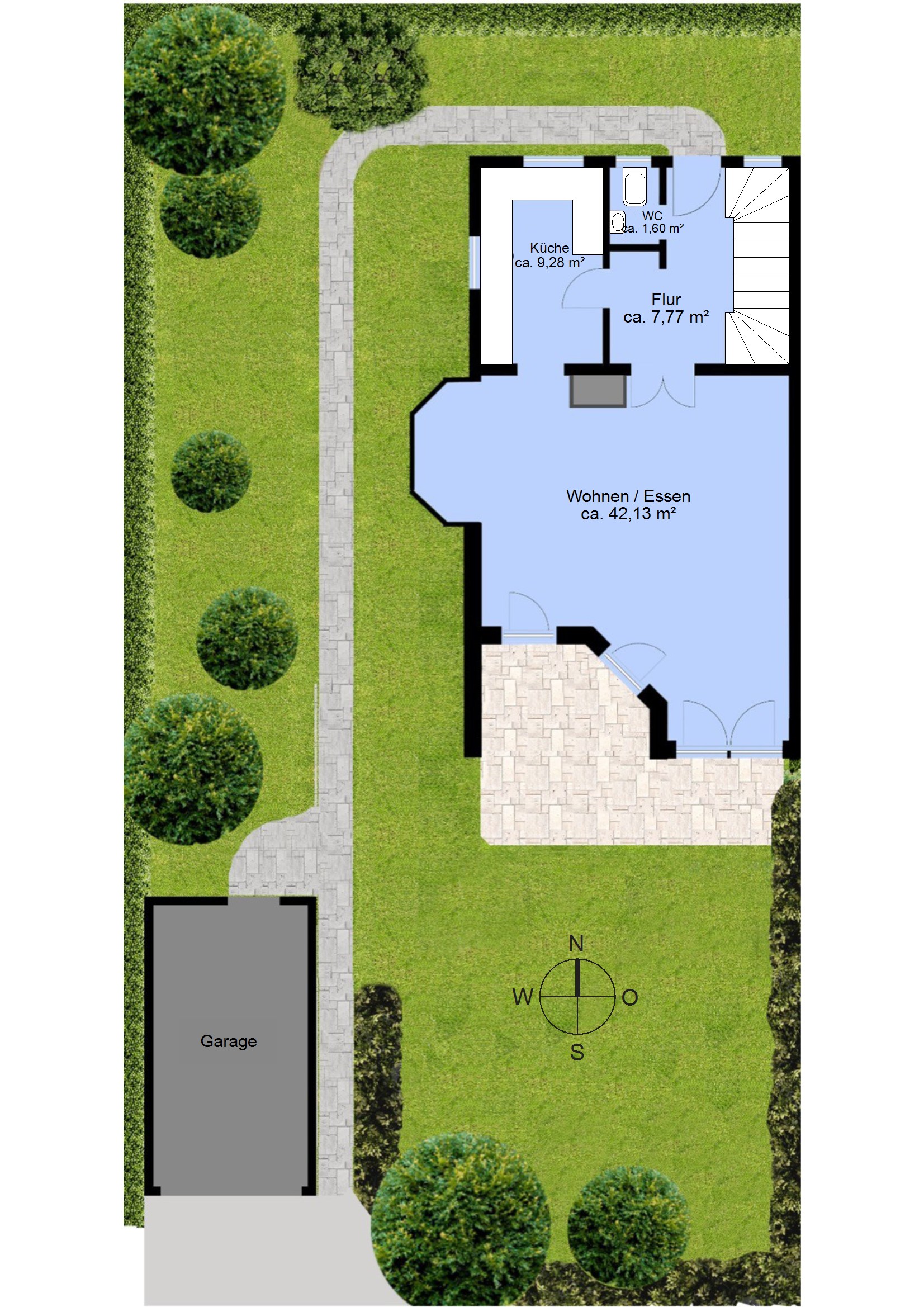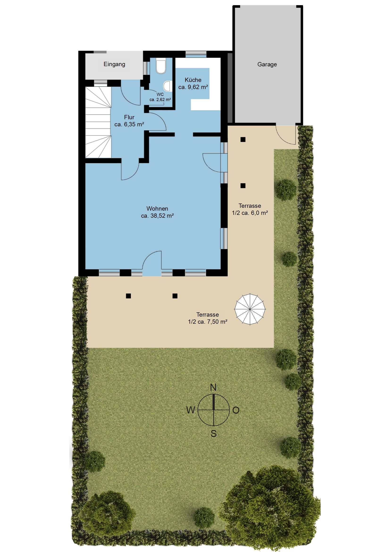Jedem Haus ist ein Miteigentumsanteil am Gesamtgrundstück mit Sondernutzungsrecht an einer jeweils ca. 400 m² großen Gartenfläche zugeordnet.