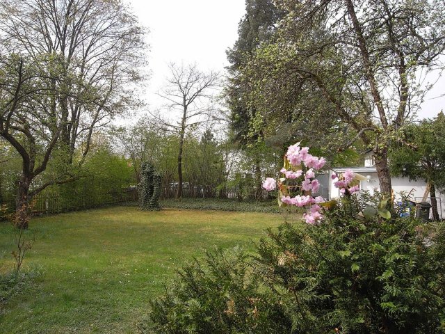 Der Garten kann quer in 2 Teile à ca. 350 m² geteilt werden, falls die beiden Mietparteien dies wünschen: Der vordere Bereich bei Garage und Gartentür gehört dann zum Obergeschoss, die zweite Hälfte, am Haus, inklusive Terrasse und seitlichem Bereich ist der EG-Wohnung zugeordnet.