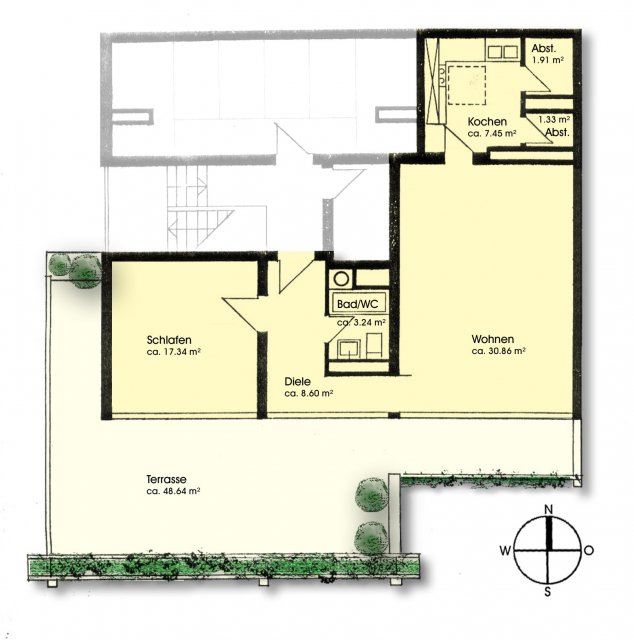 Bei der Wohnflächenangabe ist die Terrassenfläche nur mit 1/3 anstatt des sonst üblichen Ansatzes mit 50% enthalten.